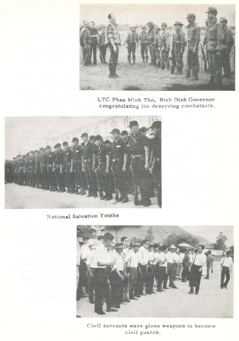 LTC Phan Minh Tho, Binh Dinh Governor congratulating the deserving c ornbatant s. I t : N atione.l Salvrtion Y outha Civil servants were given weapon6 to becorne c ivil guard s,