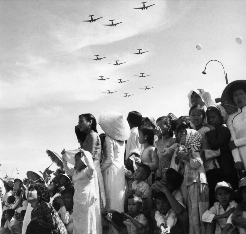 Máy bay quân sự Việt Nam bay qua đám đông trong lễ kỷ niệm tuyên bố nước Việt Nam Cộng Ḥa mới vào ngày 26 Tháng Mười, năm 1955, tại Sài G̣n.