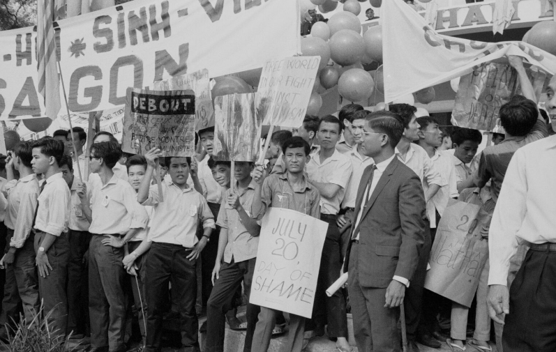 Sinh viên chống Cộng biểu t́nh ở Sài G̣n nhân kỷ niệm 10 năm Hiệp Định Geneva 1954, miền Nam Việt Nam, Tháng Bảy, năm 1964. (H́nh: Nguyễn Văn Đức/Michael Ochs Archives/Getty Images)